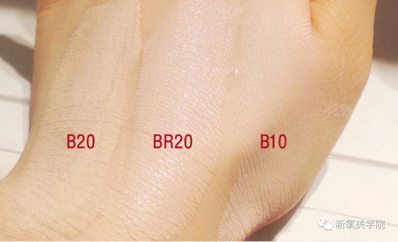 这也是为什么适合冷白皮的粉底都是发红的,中间的BR20肤色是适合冷皮的,看起来发红,另外两个就没有红色倾向。