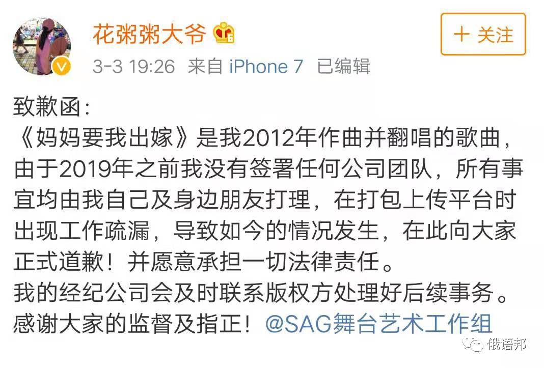 公司也在花粥致歉微博发表的10分钟之后做出了回应,向歌曲原唱歌舞团以及歌词翻译者道歉,并下架歌曲《妈妈要我出嫁》。