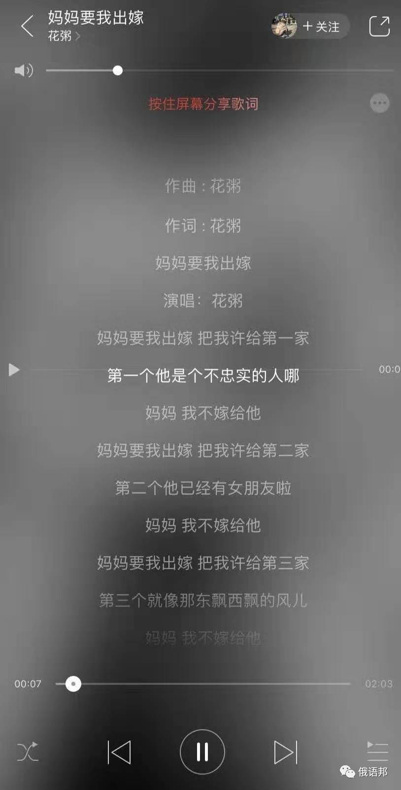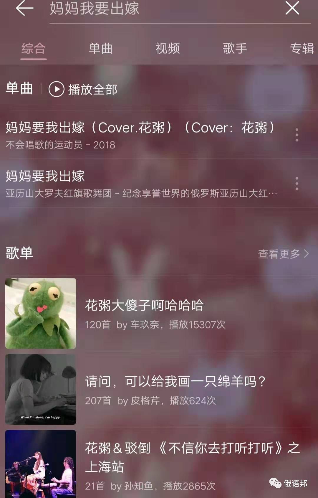 很有可能是因为听亚历山大红旗歌舞团的人根本不听花粥,听花粥的人也绝对不会听亚历山大红旗歌舞团,结果就井水不犯河水地相安无事很多年。于是昨天道歉事件之后,今天《妈妈要我出嫁》俄语原唱的评论区是这样的画风……