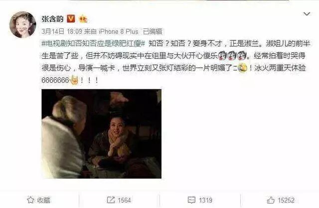 此次张含韵在剧中出演盛明兰的堂姐淑兰一角,也就是盛家的长房嫡女,在剧中的人设是一个挺悲惨的角色,连张含韵自己都说,在片场拍戏就是冰火两重天,拍的时候要很伤感要哭,一喊咔又很嗨。
