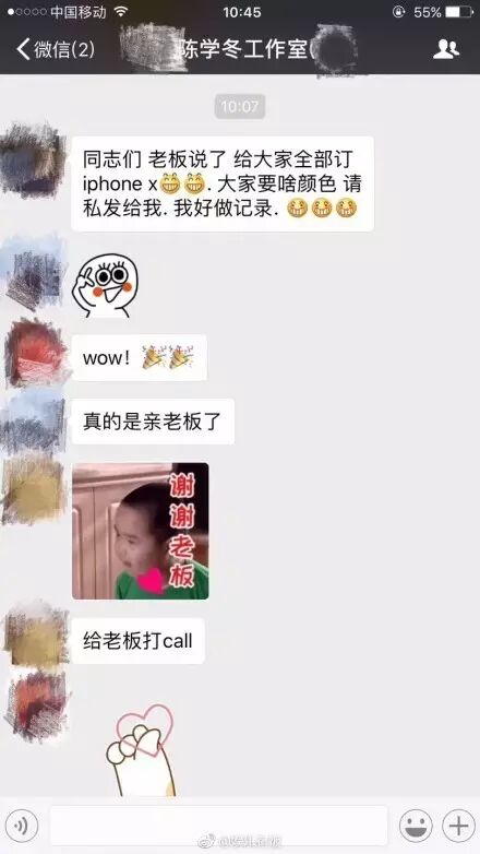 苹果公司在台湾时间13日凌晨正式发表了iPhone8以及iPhone X的详细规格,拥有全新改革功能的iPhone X随即引来网友热议,但超高售价让许多苹果粉丝望而却步。但是,一名网友在微博上曝光一张微信对话截图,上面写着陈学冬工作室,内容写道:老板说了,给大家全部都订iPhone X,并要所有员工自行选择颜色,让大家都非常惊喜。