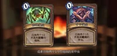 小德的英雄卡,7费获得5点护甲,抉择召唤两个1/2剧毒的蜘蛛或者两个1/5嘲讽的甲虫,都是野兽属性。
