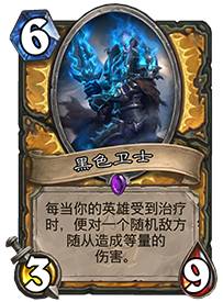 奶骑终于具备一定的输出能力了(虽然这个伤害真不怎么滴)!6费3/9和碎盾一样的身材,但是嘲讽度相当高。可以说黑卫士在场没人愿意和你抢血。抛开一张热水奶20这种绝世combo不谈,在装备大宝剑的情况下黑卫士登场基本上就能带来两点输出,更何况自走炮、光螺丝等能够提供治疗的随从站场了。弊端也很明显——随机敌方,鬼知道20点伤害会不会打到报告兵,3/9身材虽然嘲讽高了但是站场威胁还是不够大,而且英雄满血就是白板。