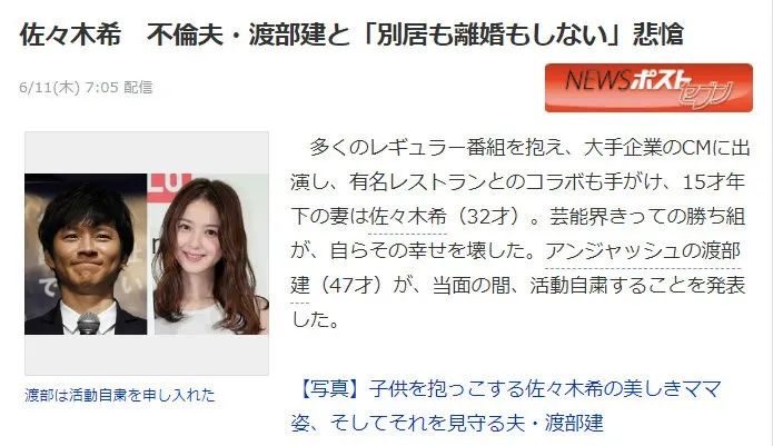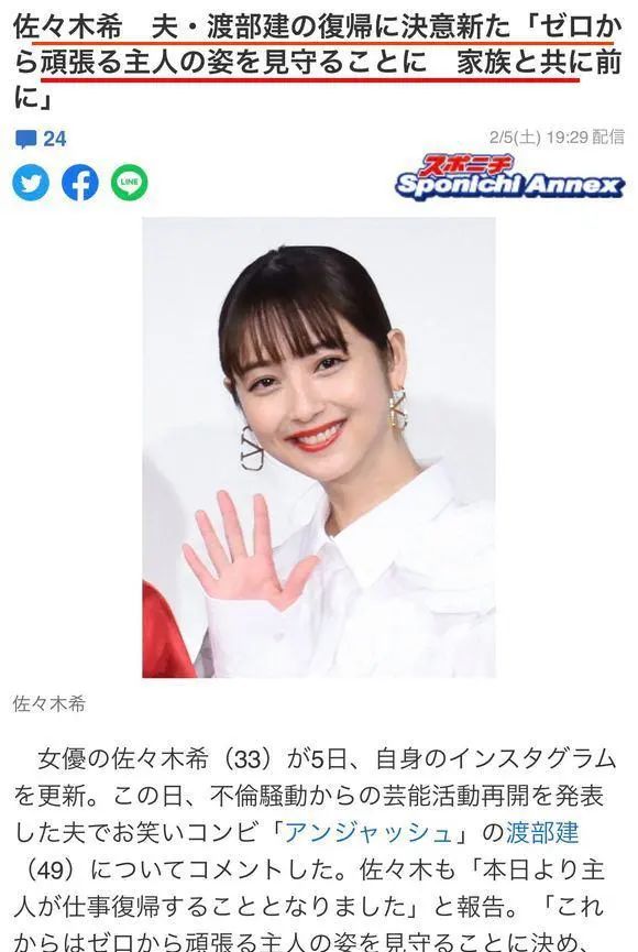 编辑:王宁哈喽,小橘子们!还记得日本演员佐佐木希吗?1988年,佐佐木希出生于日本秋田县秋田市。她从小就是美人胚子,一双大大的眼睛仿佛会说话,笑起来特别好看。中学毕业后,佐佐木希开始在杂货店打工。2005年,18岁的她被日本漫画杂志举办的“日本全国寻找美女”活动的星探发现。2006年,她的照片登上杂志之后,一夜成名,接着就获得了初代“CALCON JAPAN”冠军,成为日本初恋脸的代表之一。2008年,佐佐木希开始踏入时尚模特的行列;同年11月1日,她又出演喜剧电影《变身西装》,正式以演员身份出道。凭借着精致的面孔和苗条的身材,佐佐木希成为杂志封面的宠儿,广告片约不断。2010年,在“全球最美丽的100人”的投票中,她荣获第33名,被誉为“美国人最喜欢的日本第一清纯美少女”在出道后的十几年内,佐佐木希出演了不少影视作品:《相扑女孩》《火车》《世界奇妙物语2013春季特别篇》等等。其中令国内观众印象最深的莫过于《天使之恋》。影片中的她自然甜美,一颦一笑都散发着可爱的气息。电影中图书馆之吻那一幕,令无数观众尖叫。就是这样一位甜美可人的女孩,在2017年宣布了婚讯。结婚对象竟然是比她年长了15岁、被誉为“日本郭德纲”的搞笑艺人渡部建!这一消息引起了国内外大批粉丝的心碎,就连日本媒体也将两人称为“美女与野兽”组合。不过令人没想到的是,婚后第三年,佐佐木希口中“温柔体贴踏实”的渡部建就被曝出轨。据日媒报道,渡部建出轨对象年龄跨度从20岁到50岁:既有女艺人,也有50岁的相扑女,甚至还有30岁的男性艺人,以及女优神宫寺。对此,渡部建给出的出轨理由是:佐佐木希太邋遢了,都不会做家务。不仅如此,面对被曝光的丑闻,他丝毫不觉得愧疚,甚至为自己辩解:只是因为看到可爱的就忍不住了。他这番话令无数网友愤怒。一时间,无数铺天盖地的骂声朝渡部建涌来,甚至还有人把他的维基百科名字改成了“狗屎”。然而骂来骂去,最后还是佐佐木希出面替丈夫道的歉。她在ins上表示:不离婚、不分居。受负面新闻的影响,渡部建的事业一落千丈,还面临着天价的违约金。家里没有了经济来源,婚后身为全职太太的佐佐木希选择了复出。由于丈夫出轨全国皆知,所有人都对她抱有满满的同情与支持,因此,佐佐木希的复出事业异常顺利。不仅接到了两部剧,商务代言也十分可观,甚至还被发现悄悄地以个人名义买了4亿日币的豪宅。与此同时,关于佐佐木希与渡部建将离婚的传言也愈演愈烈。就在所有人以为佐佐木希将选择离婚、化身独立女性全心全意地搞事业时。但她接下来的行为却出乎所有人意料。在日本每年举办的公益节目中,佐佐木希不顾任何形象地扮鬼脸、表演蹩脚的喜剧;在狗仔蹲守的地点,她陪丈夫散步、展现一家三口温馨场面。而这一切,都是她为了让丈夫能够成功复出!不久之后渡部建就成功复出,佐佐木希下一秒也立刻否认了离婚传闻。11月17日,佐佐木希在ins上宣布了自己怀二胎的消息,简单的几句话,可以轻松地从中读出她的开心和满足。随后,渡部建也发布了ins,语气中是难掩的开心。夫妻二人公布的喜讯令所有人感到震惊,中日两国网友祝福的寥寥无几,更多的都在怀疑佐佐木希是不是疯了:明明可以靠自己获得更好的事业和前途,却非要依赖一个男人生活。这种娇妻行为实在令人费解!既然佐佐木希选择做娇妻,那我们只能尊重祝福。 最后两句你怎么看待佐佐木希生二胎的行为?还想看橘讲哪位明星? 2022年 HAVE A GOOD TIME
