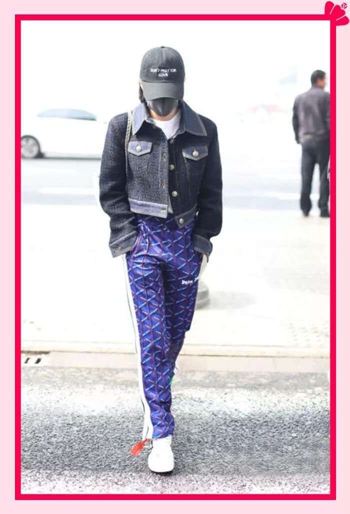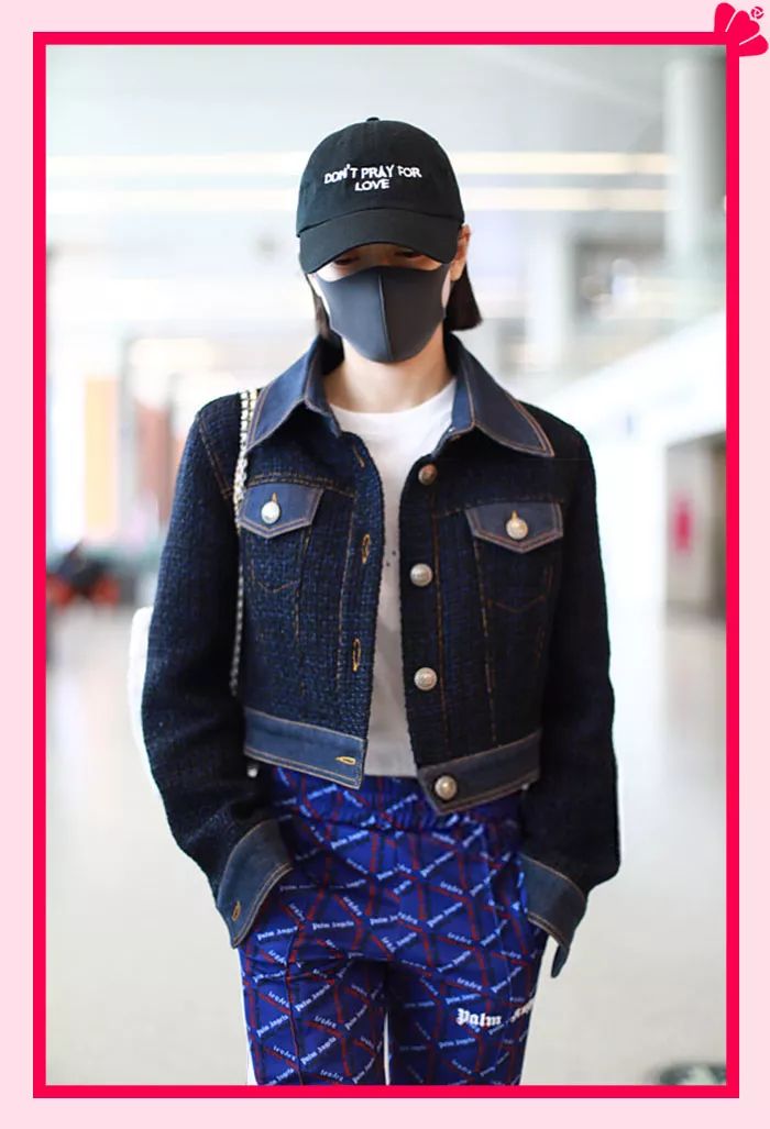 4月6日上海,宋茜机场街拍。一顶黑色的棒球帽,黑色的牛仔夹克,搭配Palm Angels的紫色侧条纹运动裤,白色系带运动鞋加同色Chanel毛呢水桶包,大胆混搭潮范十足!