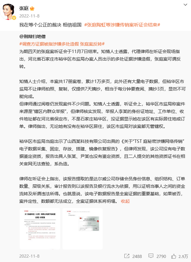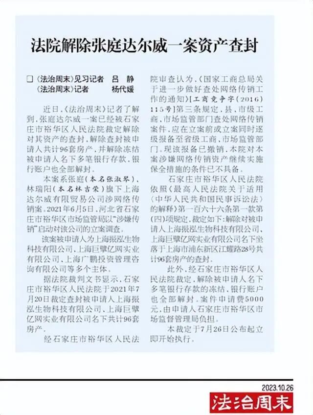 张庭96套房产解封 三峡晚报 港台女星 2023-10-26 16:29:19 151 创作不易,用心坚持,欢迎请BaGua喝几杯爱心咖啡!打赏并支持本文 打赏并删除本文 10月26日,据《法治日报·法治周末》报道,张庭达尔威一案已经被石家庄市裕华区人民法院撤销,同时解除查封被申请人共计96套房产,并解除冻结被申请人名下多笔银行存款,银行帐户也全部解封。张庭丈夫林瑞阳回应称,“我们的案子终于结案了,而且是非常正面的结案。我们会在全球各地重新找回我们的代理。”据了解,石家庄市裕华区人民法院于2021年7月20日裁定查封了张庭和林瑞阳名下的96套房产,该房产位于两人经营的达尔威公司新大楼,价值逾17亿人民币。当时,法院是以涉嫌“组织策划传销违法行为”查封两人的房产,指出两人公司通过传销方式在3年内营收91.71亿,利润逾1927万元,有关部门没收违法所得1927.99万元,罚款170万元。此前,2022年11月8日,该案听证会结束时曾被曝出案件反转,张庭本人当时转发相关微博回应:我在等个公正的裁决 相信祖国。张庭微博截图据红星新闻消息,红星资本局从张庭及林瑞阳夫妇一方的代理律师处了解到,该法院已于今年7月对该案作出相关裁决。判决书显示,法院经审查认为,《国家工商总局关于进一步做好查处网络传销工作的通知》规定,县、市级工商、市场监管部门查处网络传销案件,应在立案前或立案同时逐级报备至省级工商、市场监管部门。现该报备已撤销,本院对本案涉嫌网络传销资产继续实施保全措施的条件已不具备。前述代理律师还介绍称,张庭、林瑞阳夫妇及旗下公司此前被冻结的多笔银行存款已经被解除冻结,银行账户也已解封。网友表示:——迄今为止,我人生能有96套的东西只有做过的考试卷子;——不怕,我虽然没有96套房,但是我有996;——我就不一样了,我有96根头发;——贫穷限制了我的想象,这是一个天文数字;——真厉害!96套房还是被封,还有没被封的呢,所以一共有多少套房?来源丨九派新闻编辑丨万霜二审丨周泉终审丨胡俊奎记得星标点点在看 让声音传得更远 创作不易,用心坚持,欢迎请BaGua喝几杯爱心咖啡!打赏并支持本文 打赏并删除本文 感谢您的支持鼓励,我会继续努力的!文章地址:用户邮箱:打赏金额:USDT 请输入数字点击”去打赏“,即可进行打赏支持本文章哦 张庭 发表评论