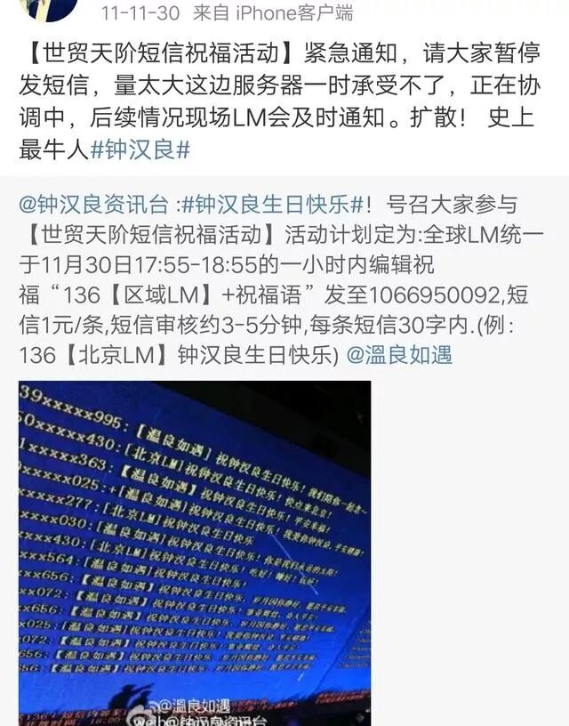 同年还有一个十分夸张的案例是,11月30日钟汉良生日之时,全国各地的粉丝相约用发送短信到世贸天阶表白屏幕上的方式给钟汉良庆生。