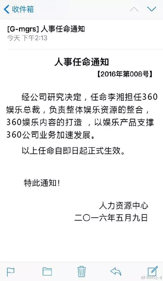 2016年3月,加盟奇虎360,任职副总裁及首席内容官,分管360影视以及相关内容业务。2015年5月9日,出任360娱乐总裁,负责娱乐资源的整合。