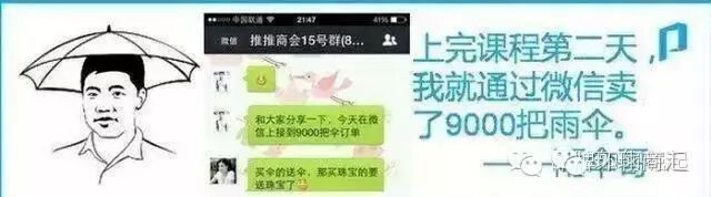 1)雨伞哥:上完课程第二天就通过微信卖了9000把雨伞;