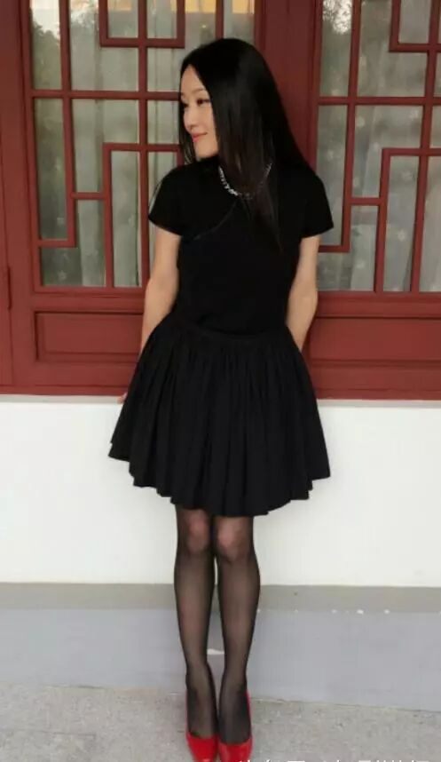 杨钰莹身穿一件黑色连衣裙彰显妩媚迷人的气质,脚踩一双红色高跟鞋十分亮眼,黑色薄丝袜性感又显瘦。