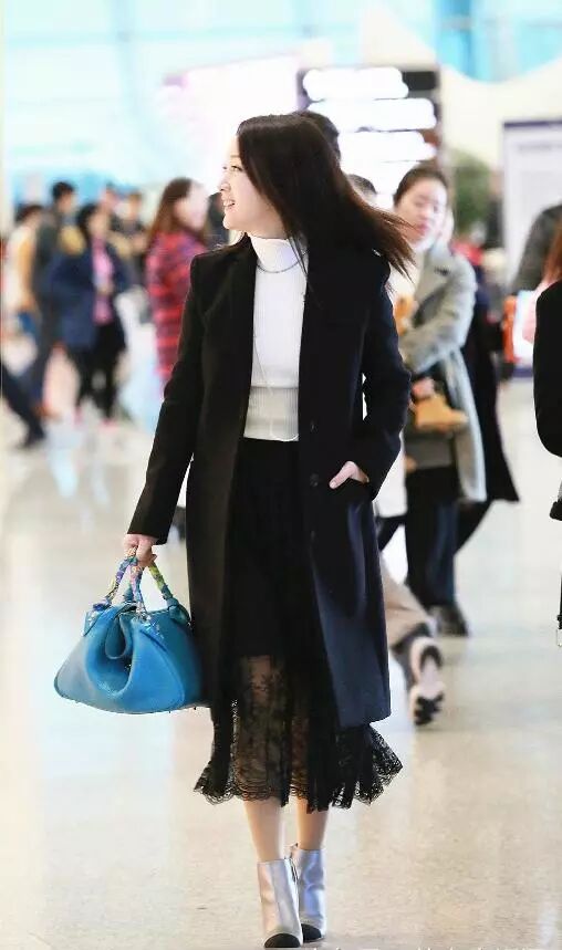 白色高领毛衣清新百搭,下身穿着黑色蕾丝长裙轻盈飘逸,脚踩一双银色短靴彰显狮山品味,黑色毛呢大衣充满女人味。