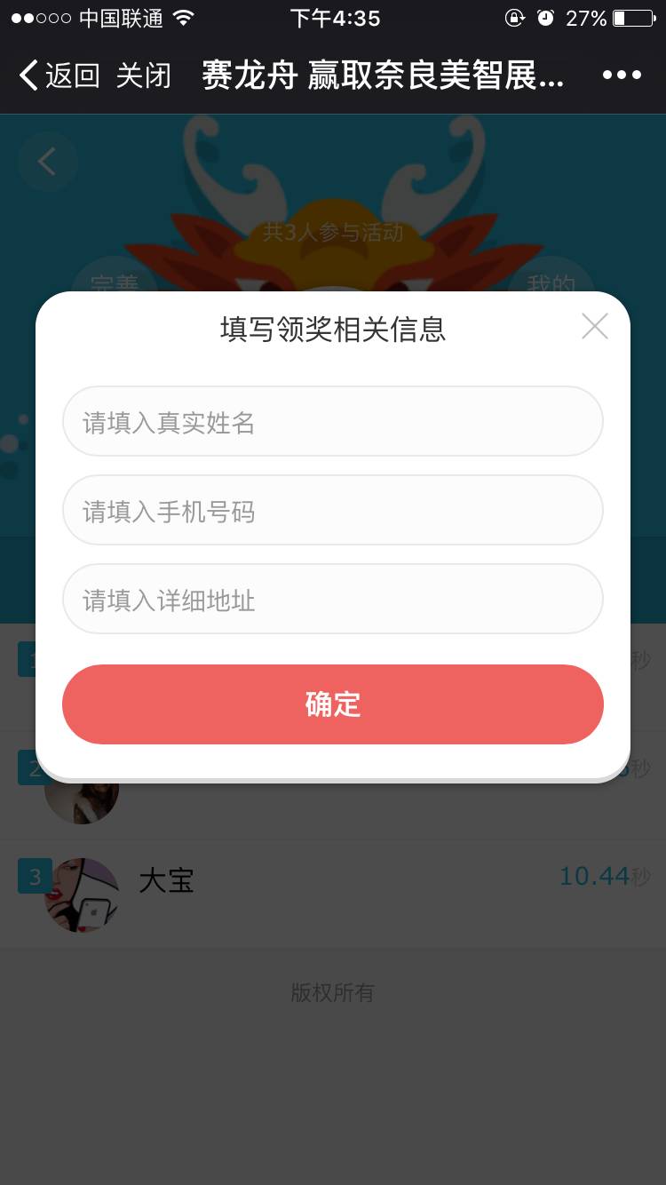 游戏结束后,点击“完善资料“,留下您的姓名,地址和联系方式,排行榜前十名的小伙伴将收到益涂快递出的奈良美智作品展入场券!