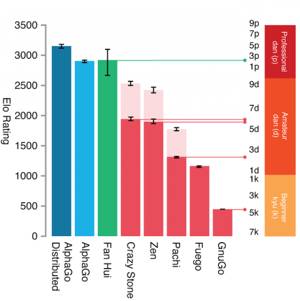虽然竞争对手众多,但以目前DeepMind公布的数据来看,AlphaGo在众围棋AI中实力稳居第一:AlphaGo和其他的围棋AI进行较量,在总计495局中只输了一局,胜率是99.8%,并尝试让4子对阵Crazy Stone、Zen和Pachi,胜率分别是77%、86%和99%。