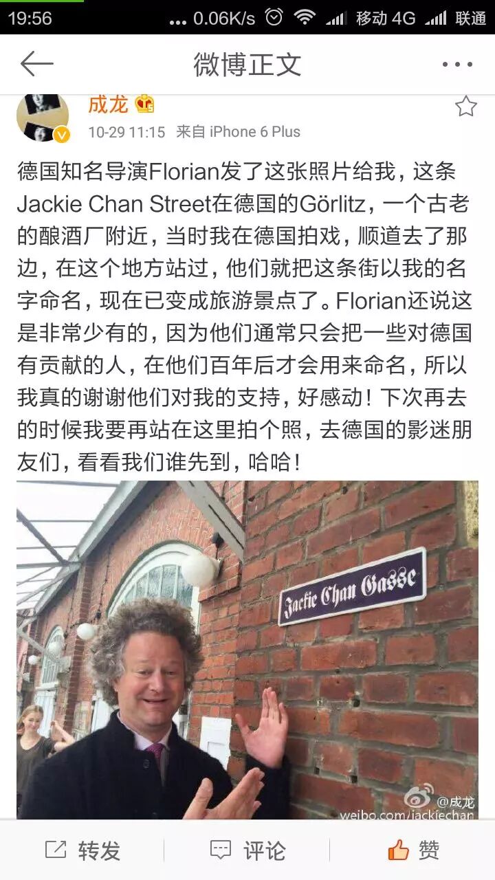西方人一说到中国,脑子里就会想到成龙。在德国,有一条街,用成龙的名字命名。