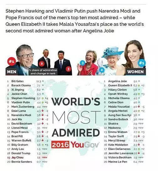 2016年世界最受钦佩人物排行榜上,成龙高居第四,前三位分别是比尔·盖茨、奥巴马、主席。