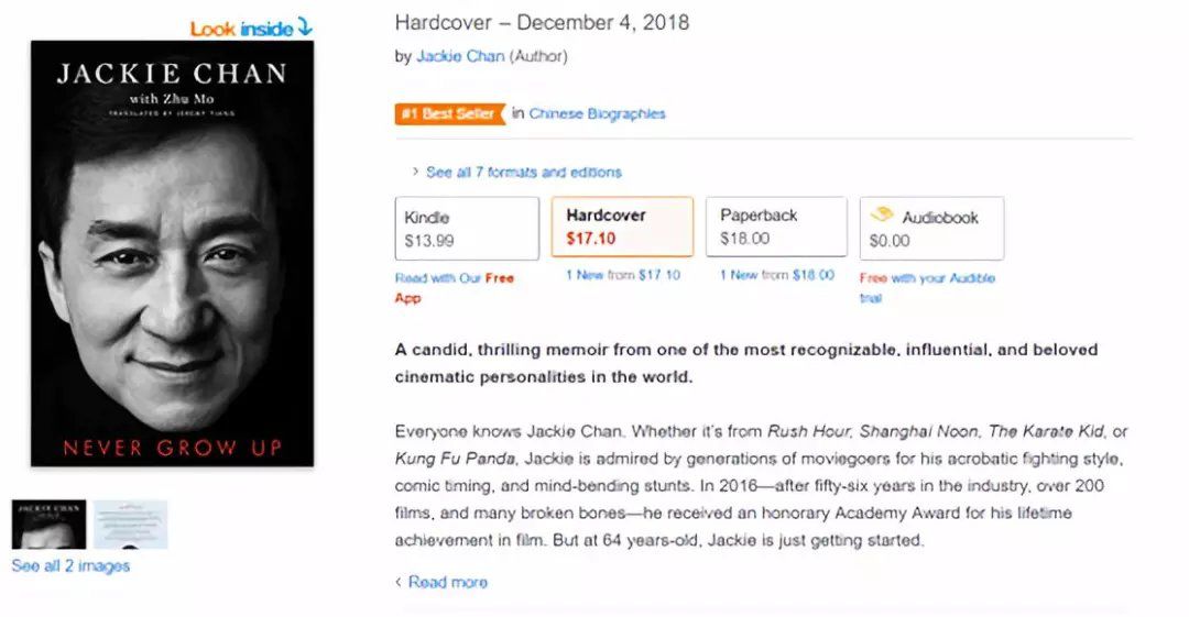 这本自传名叫《成龙:还没长大就老了》(英文版Never Grow Up),中文版在3年前就出版了,但英文版则在前几日刚刚上架。