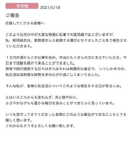 新垣结衣与星野源的结婚新闻稿