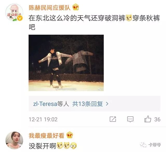 陈赫穿着一条破洞裤在外面得瑟,还说被冻到裂开。