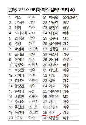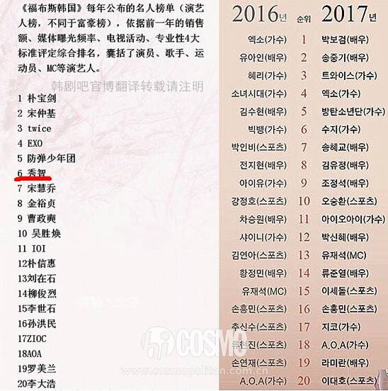 对比2016年和2017年的韩国福布斯名人榜,秀智从39位晋升第6位,力压群芳。人气和热度相当高。