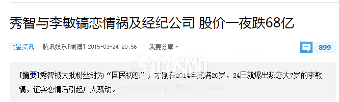 数据也可以证明,两位公布恋情之时,秀智所在的经纪公司JYP一夜之间损失韩币68亿元,折合人民币约3800万。