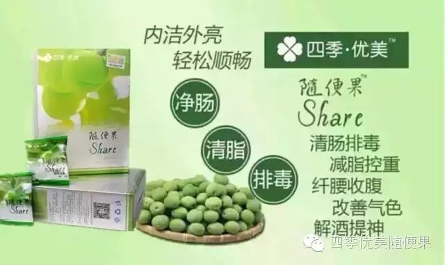 四季优美随便果源自台湾,扎根大陆,产品通过具有国际公信力的谱尼测试,有太平洋保险公司5000W赔付的承保,远销欧美等几十个国家和地区,深受广大消费者信赖。随便果的载体是一颗青梅,是一种富含多种维生素,经过四个月发酵,再附以美白淡斑的桑叶粉,清肝明目的决明子,绿色清道夫的膳食纤维,降脂降压的马黛茶,增加免疫力的胡萝卜素。可以帮你清肠排毒,达到消除便秘,消痘去斑,醒酒护肝,减脂控重,降三高,调节内分泌的功效。