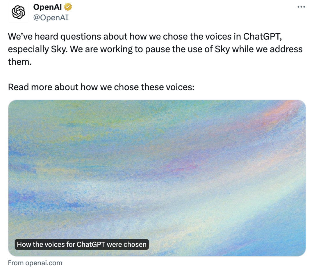 OpenAI深更半夜发表推文,Sky声音已经撤掉