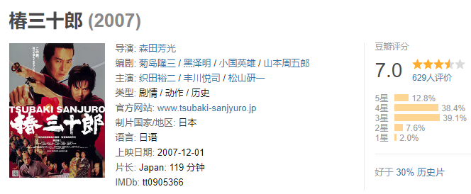 光看演员剧照,就觉得日本人真是越涨越丑了,1962年的《椿三十郎》中的演员无论是主角还是配角,颜值都碾压这一部,虽然当时是黑白照,但是新版的这歪瓜裂枣的都是些啥?完全没有了日本人当年的风采,还tm演武士?