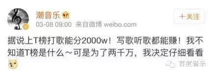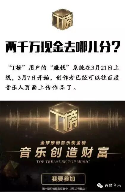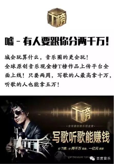 全球首个原创音乐现金榜——T榜,在3月7日正式全面上线!打着史上“最洋气赚钱方式”的旗帜,以一亿两千万现金+资源面世的T榜震惊整个华语乐坛,引起众多评论人和媒体议论纷纷,“这个拥有巨资的榜单到底会为音乐行业及大众选择带来怎样的革命巨变”,舆论的同时,大家也在蠢蠢欲动,开始对“T榜”的玩法,以及如何才能分到钱热烈讨论......