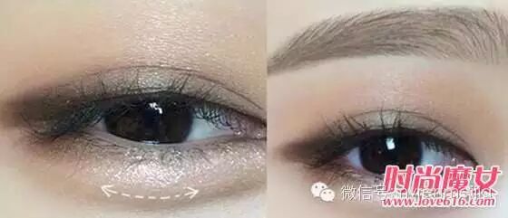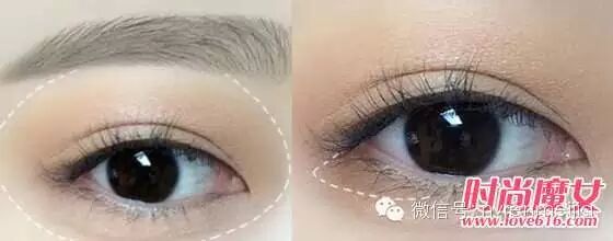 STEP1:用肤色的亚光眼影,大面积涂抹在眼周,就是上图椭圆形的位置。