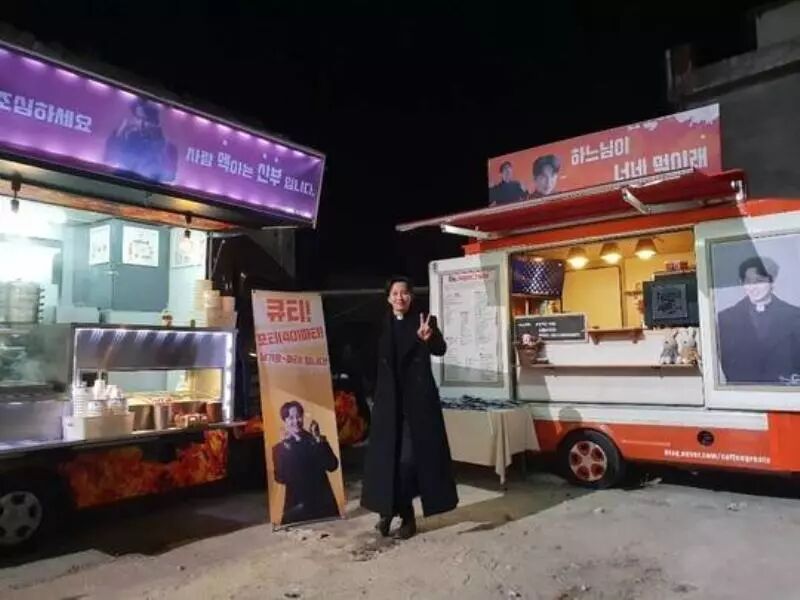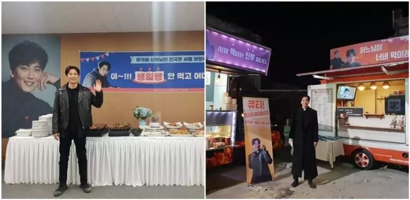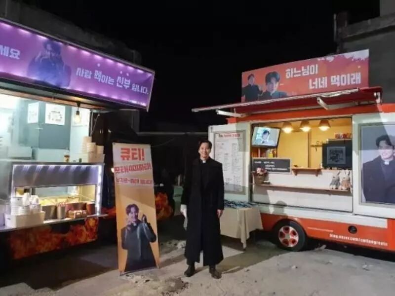公开的照片中金南佶站在热情粉丝们送来的咖啡应援车前帅气留影,电视剧中的金南佶曾说过的一句名台词,被粉丝们故意搞笑写成「老天爷喂你吃」「喂人的就是神父」「可爱40派对!南佶的派对!」等等超有sense的句子,令人看了不禁莞尔一笑。