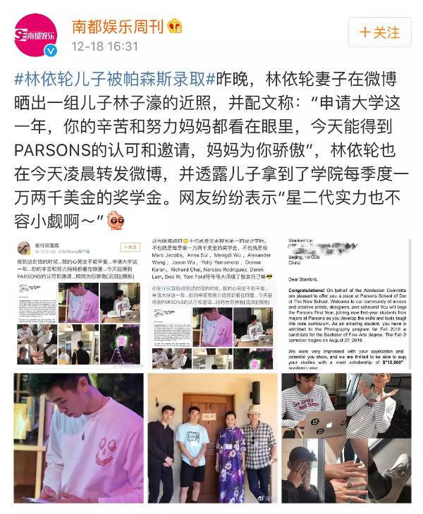 昨天热搜第一被林依轮霸占了好久,因为林依轮的儿子考上了纽约时尚设计第一名校帕森斯。
