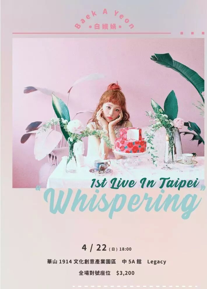 在韩国被称为「清新天籁」的白娥娟,4月22日,在宽宏得主办下来到台湾举办「Beak A Yeon 1st Live“Whispering”In Taipei」。这是白娥娟出道之后首度的访台演出。让乐迷感到非常的期待。