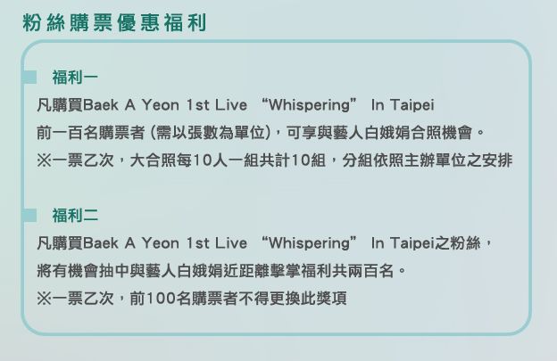 凡购买Baek A Yeon 1st Live “Whispering” In Taipei前一百名购票者 (需以张数为单位),可享与艺人白娥娟合照机会。