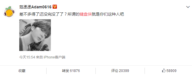 如今,范丞丞发文怒怼键盘侠,说到:“差不多得了还没完没了了?所谓的键盘侠就是你们这种人吧”