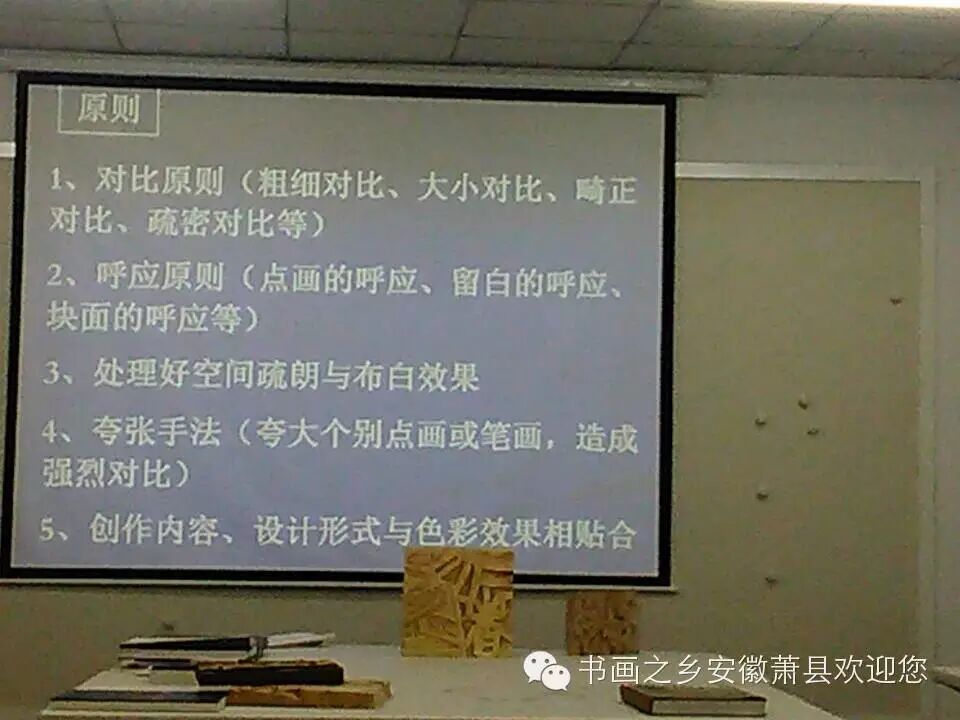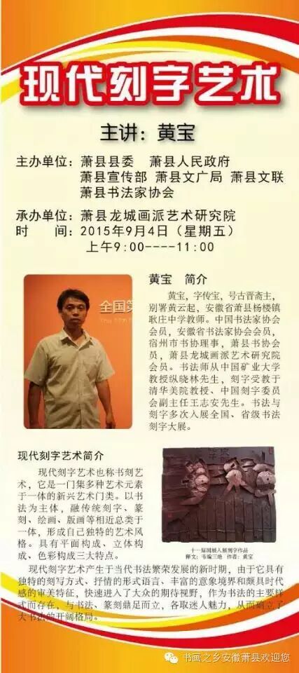 2015年9月4日上午,由萧县县委宣传部、县文广新局、萧县文联、萧县书法家协会主办的《现代刻字艺术》讲座在龙城画派艺术研究院举办。本次讲座主讲人是十一届国展刻字中入展者黄宝老师。