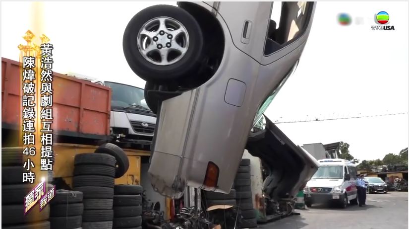 既出动警车, 又倒吊一台私家车, 就知道这场戏耗用有多大。 一众演员,日夜赶拍戏的黄浩然也说道: “ 捱眼训是很辛苦的事情。”