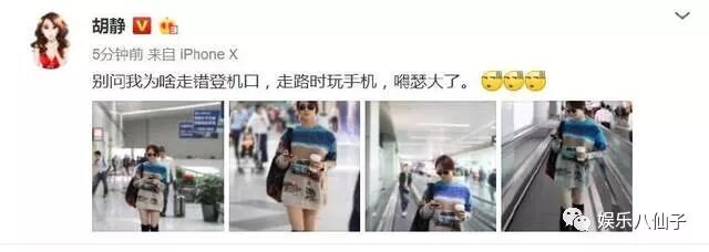 近日胡静因为走路玩手机而走错登机口,并晒出照片和大家分享。