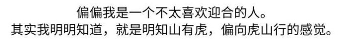 “偏偏我是一个不太喜欢迎合的人。其实我明明知道,就是明知山有虎,偏向虎山行的感觉。”