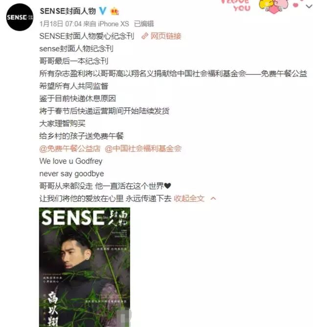 1月18日,SENSE封面杂志出版并出售了高以翔一生的杂志。官方微博在公开销售中强调,这是高以翔的最后一本纪念杂志。所有杂志利润将以哥哥的名义捐赠给中国社会福利基金会的——免费午餐慈善机构。希望所有人共同监督。在出售杂志的同时,网民们也被敦促理性购买,并为农村儿童提供免费午餐。