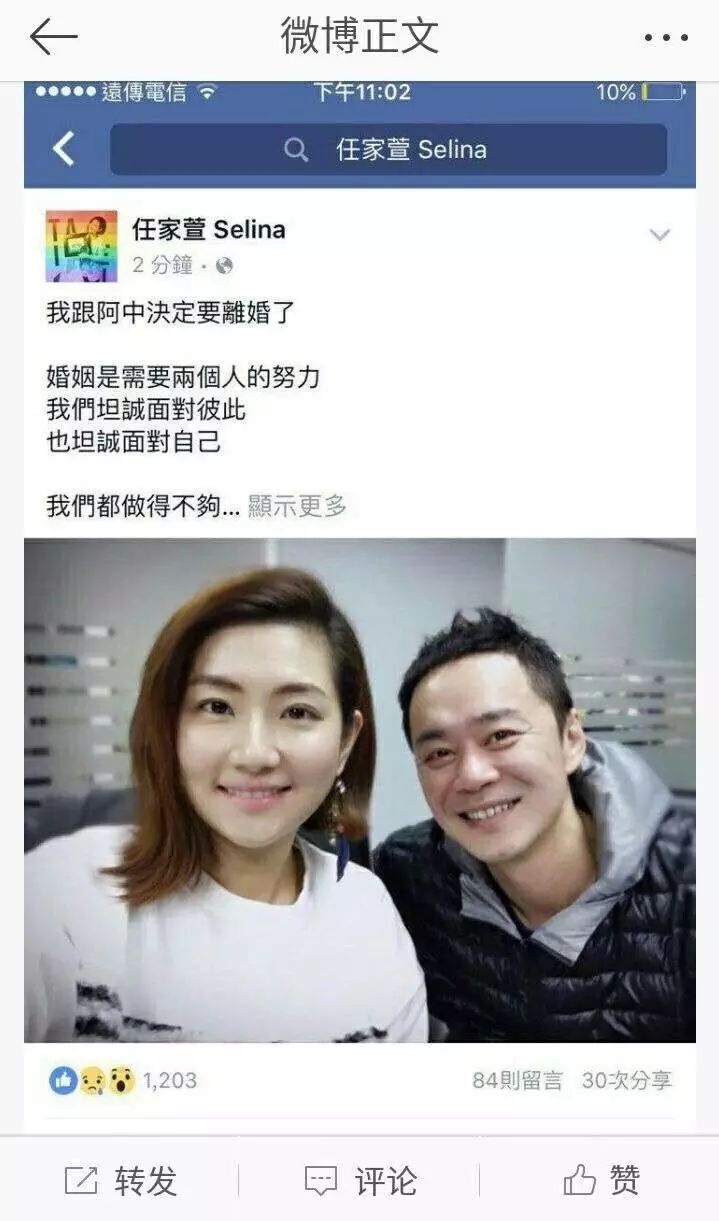然而这段被大多数人看好的婚姻却并不长久。就在2016年3月4日,Selina通过社交网站Facebook宣布了与张承中离婚。