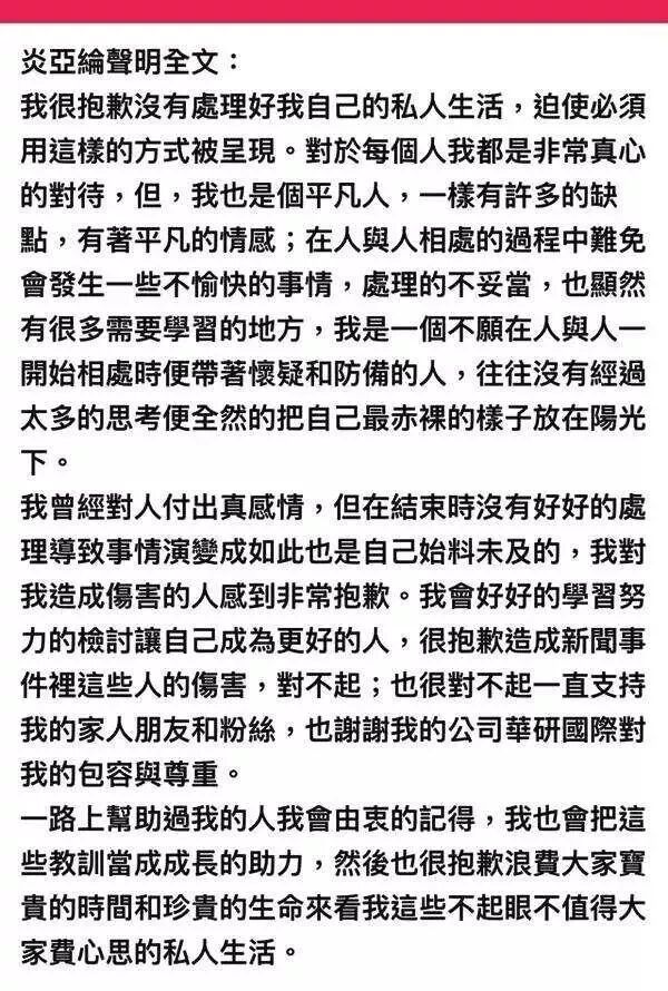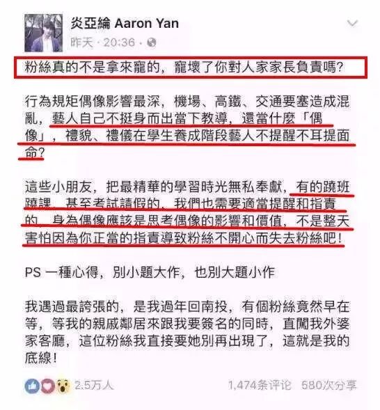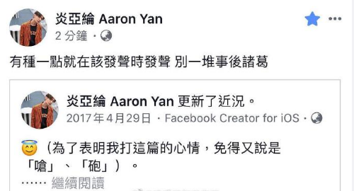 炎亚纶在脸书直言:“现正热映‘马后炮型虚伪社会’。”他转发了一篇两年前写下的“呼吁行展会资讯业规范”。其中提到剧组人员因工时过长,导致车祸、癫痫等,台湾地区小演员受到的不公平待遇...最后说别再纵容小错误,也勿以善小而不为,模式冷眼的方式最终我们大家都会自食恶果。