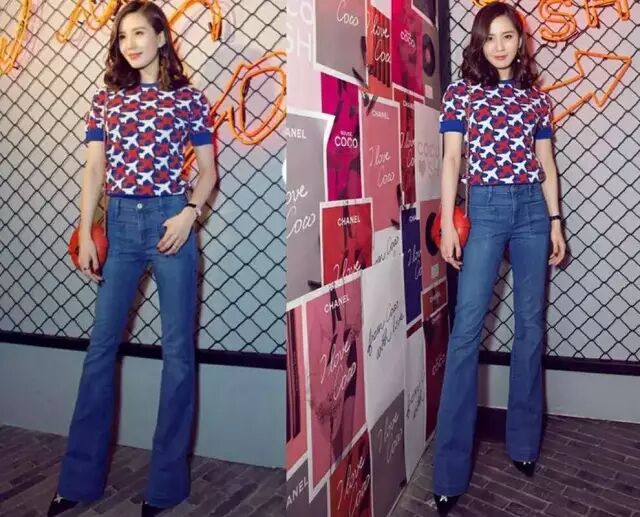 刘诗诗牛仔高腰阔腿裤搭配小皮衣
