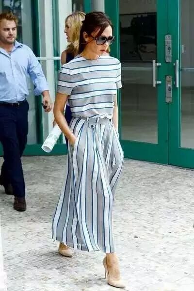 白百合的露肩短打搭配高腰条纹阔腿裤