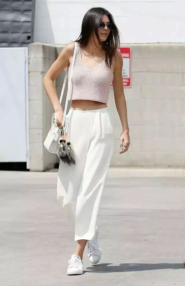 绿色的无袖挂脖短打搭配白色阔腿裤