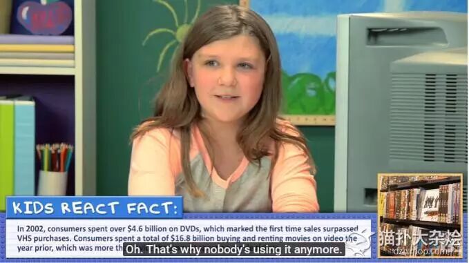 主持人还说,以前人们会开车到很远的地方去租录像带,这也让小孩们无法想象,现在他们都是直接在网上下载来看或者网购光盘回家看