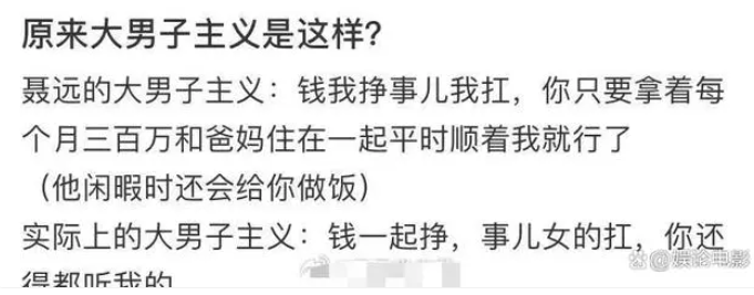 聂远的大男子主义,是钱我挣事我扛,你只要拿着每个月300万和爸妈住一起,平时顺着我就行了。