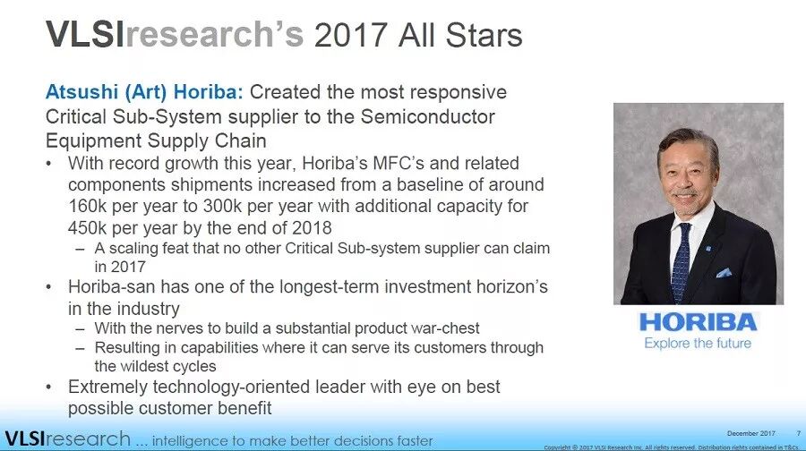 中国半导体蓬勃发展的2017年,这一整年中在Mr.Atsushi Horiba 带领下,作为半导体设备核心器件供应商,我们致力于生产满足客户要求的产品,始终以客户需求为核心不断发展最新技术。在付出所有的努力与坚持,我们非常荣幸的通知各位: