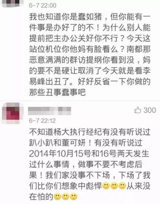 前面几次的事件也有粉丝在杨迦茵的微博下提到,还特别提醒她“有没有听说过2014年10月15日和16日两天发生什么事情”,然后强调“粉丝比你想象中彪悍”。