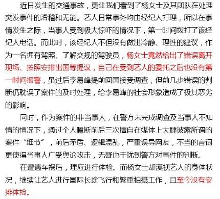 长微博里也着重提到了这一点,认为经纪人错误引导了李易峰在车祸后离开现场,给外界留下酒驾肇事的猜测。另外,粉丝还指责经纪人多次就这件事接受媒体采访透露了太多细节,但这些细节又催生了更多漏洞,导致李易峰受到接连不断的舆论谴责。