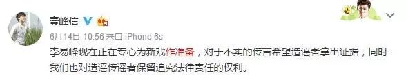 不过呢,客观来说,李易峰的经纪团队在应对危机层面也并不是清一色大写的差。像前几天李易峰被传出吸毒的新闻,当时经纪团队的反应就很迅速,在事件刚刚发生还没来得及大规模发酵的时候,就斩钉截铁否认传闻,同时委托律师发布声明,语气强势、不给造谣者留余地,当时很快就把这一波传闻扼杀在了摇篮里。